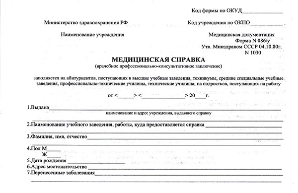 Медицинская справка 086/у - коллегиальное решение комиссии врачей о допуске абитуриента к поступлению в высшее учебное заведение. Для того чтобы оформить справку, необходимо посетить хирурга, терапевта, ЛОРа, невропатолога, окулиста и гинеколога (для девушек), а также сдать ряд анализов. Сдача всех необходимых анализов и посещение врачей может занять длительное время.