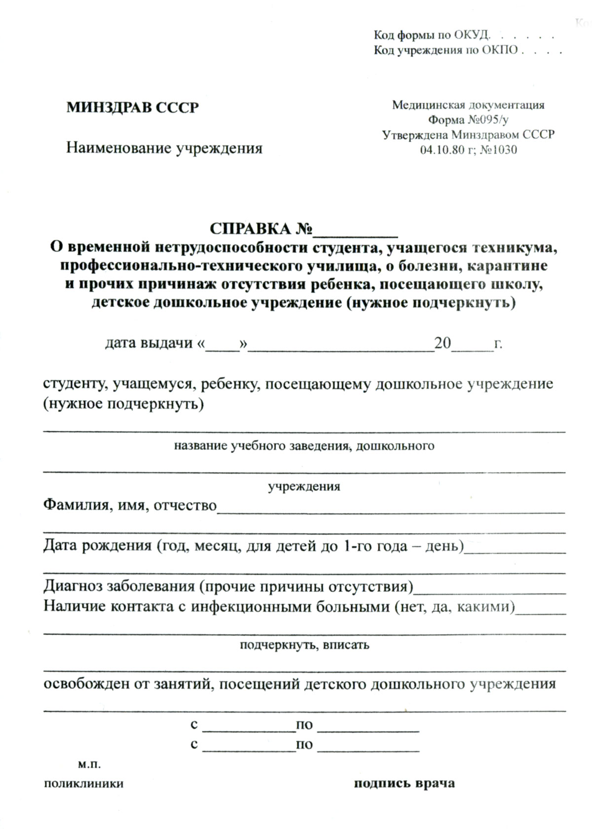 Медицинская справка 095 - основной документ, позволяющий получить освобождение от посещения учебного заведения для школьников и студентов. Как правило, документ выдается лечащим врачом, который выносит решение о нетрудоспособности ученика. Эта справка также может использоваться в качестве освобождения от физкультуры в легких случаях заболевания.